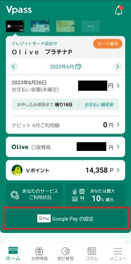 Vpass アプリから [Google Pay の設定] をタップします。